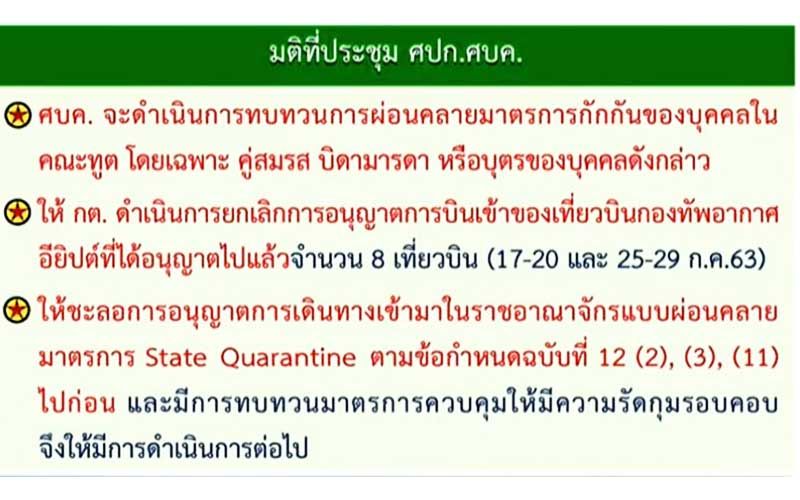 2.ให้กระทรวงการต่างประเทศ (กต.) ดำเนินการยกเลิกการอนุญาตการบินเข้าของเที่ยวบินกองทัพอากาศอียิปต์ที่ได้อนุญาตไปแล้วจำนวน 8 เที่ยวบิน (17-20 และ 25-29 ก.ค.63)