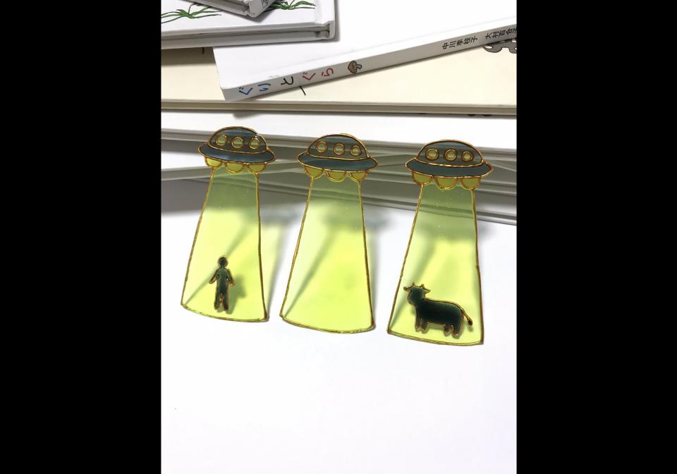 レジンを使って自分で作ったというしおりは、UFOの形をしている。UFOからは黄色い光線が放たれ、人や牛がその光にとらわれている。
