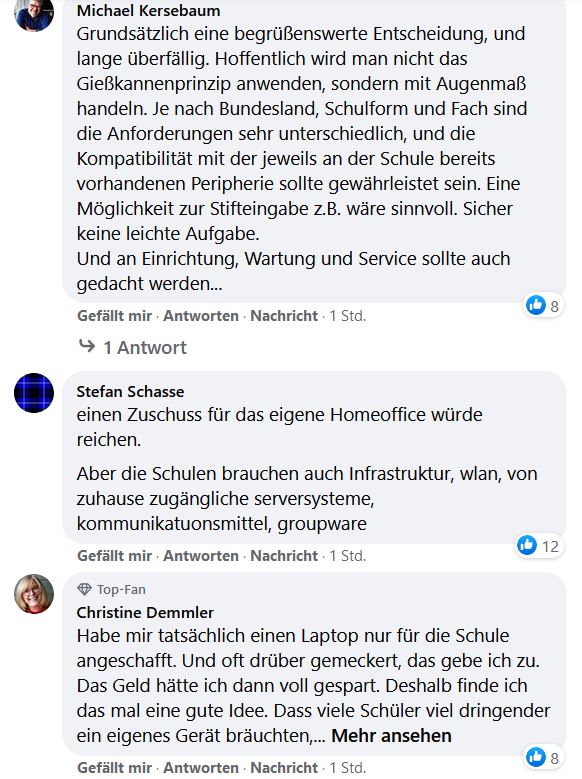 „Nach heftiger Kritik und basierend auf unseren Forderungen kommt jetzt endlich bei der Politik an: Für die Digitalisierung in Schulen braucht es die entsprechende Ausstattung. Die veröffentlichten Vereinbarungen des Bildungstreffens sind so konkret, wie wir es gestern eingefordert haben. So ist es gut, dass gemeinsam von Bund und Ländern Bedingungen für das digitale Lehren und Lernen geschaffen werden sollen. Neben digitalen Geräten für Schülerinnen und Schüler, sind nun auch die Lehrkräfte in den Fokus gerückt und sollen ausgestattet werden. Das muss dann Hand in Hand gehen mit ihrer Fortbildung, damit die Geräte optimal für das Lehren und Lernen eingesetzt und ein pädagogischer Mehrwert erzeugt werden kann. Denn das muss trotzdem klar sein: Digitalisierung ist nicht Selbstzweck, sondern Mittel. Die Entscheidung über die Lehr- und Lernmittel obliegt der Lehrkraft entsprechend ihrer Einschätzung zu den notwendigen Maßnahmen zur individuellen Förderung der Schülerinnen und Schüler.“.